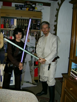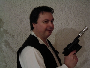 Star-Wars-Fan bin ich bereits seit 1978, als die ersten Ausschnitte von "Krieg der Sterne" in einer Kinosendung im Fernsehen gezeigt wurden. Von diesem Moment an sammelte ich alles, was ich über den Film in die Finger bekommen konnte. Da der Roman zum Film damals vor dem Filmstart erschien, beging ich leider den Fehler, das Buch zu lesen, bevor ich den Film gesehen hatte. Obwohl mir dann im Kino alles etwas bekannt vorkam, war ich trotzdem unendlich begeistert - eine Begeisterung, die bis heute ununterbrochen angehalten hat. Bei mir gab es nie eine "Auszeit" was Star Wars anging, wie bei so manch anderem. Seit 1980 bin ich in mehreren Fanclubs aktiv, die damals wie Pilze aus Felucia schossen. Ich trug hauptsächlich mit Zeichnungen zu den Fanzines bei, wobei die "Krönung" meines bisherigen Schaffens der über 40seitige Comic "Han Solo und der Schatz vom Bandaru" ist. Anfang der 80er Jahre drehte ich mit einem Kumpel zwei Super-8-Amateurfilme mit den Kenner-Figuren: "Darth Vaders Rache" (der direkt an Episode IV anschließt) und die Verfilmung meines Comics "Han Solo und der Schatz vom Bandaru", dessen Handlung vor Episode IV spielt. Allgemein bin ich ein fanatischer Han-Solo-Fan und sammle (fast) alles, was ich zu ihm bekommen kann. So war dann auch das Outfit des corellianischen Schmugglers mein erstes selbstgemachtes Kostüm, das seine Premiere bei der Jedi-Con 1983 in Frankfurt hatte. Nachdem Anfang der 90er Jahre das Fandom durch die Romane von Timothy Zahn einen Aufschwung erlangte und das Interesse an Star Wars wieder anstieg, gründete ich mit Hilfe des Offiziellen Star Wars Fan Clubs 1994 das erste (und einzige) saarländische Star-Wars-Dinner, dem ich naheliegenderweise den Namen "Saar-Wars-Dinner" gab. Bis heute erfreut sich dieses zwanglose Treffen regionaler Science-Fiction-Fans großer Beliebtheit. Schon als Tradition zu bezeichnen wäre unsere alljährliche Endor-Grillparty im Sommer, auch als "Ewok-Grillen" bekannt. Ebenfalls zusammen besuchen wir Conventions wie z. B. die grandiose Jedi-Con des OSWFC, die leider nur unregelmäßig alle drei bis vier Jahre stattfindet. Nachdem Ende der 90er Jahre dann auch endlich die erste Trilogie Realität wurde, war das für mein "Fan-sein" wie eine Verjüngungskur. Ja, mir gefallen Episode I bis III genauso gut wie die alte Trilogie! Besonders bei Episode I überkam mich ein lange vergessen geglaubtes Gefühl wie damals bei Episode IV. Nach fast 20 Jahren endlich wieder ein neuer Star-Wars-Film im Kino! "The Phantom Menace" hat mich mitgerissen wie ein Hypersturm, und Jar Jar Binks zählt zu meinen absoluten Lieblingscharakteren in der Saga. Denn genau das ist Star Wars für mich: Eine Geschichte, unterteilt in sechs Episoden. Für mich ist keine Episode besser als die andere. Bei einem Buch kommt ja auch niemand auf die Idee, bestimmte Kapitel blöd zu finden oder ganz zu ignorieren. Daß einem Star-Wars-Fan die neuen Filme nicht gefallen, kann ich überhaupt nicht nachvollziehen. Jedenfalls war mein zweites Kostüm, das ich mir zulegte, das eines Jedi-Ritters, und zwar des Alderaaners Ah-Kim Dorr, eine Figur, die ich gelegentlich bei unseren Star-Wars-Rollenspielrunden darstelle. Mittlerweile habe ich das Kostüm um ein Plo-Koon-Outfit ergänzt, das ich nun wahlweise tragen kann. Wie viele Fans bin auch ich Sammler, wobei mein Hauptsammelgebiet die Actionfiguren von Kenner bzw. Hasbro sind. Besonders die 12"-Figuren haben es mir angetan, besonders die neuen, unglaublich detaillierten von Sideshow Toys. Aber auch Actionfiguren zu anderen Filmen und TV-Serien gehören zu meinem Sammelgebiet. Bisher besitze ich etwa 1200 Actionfiguren, wobei über 700 davon Star-Wars-Figuren sind. Darüber hinaus sammle ich auch Comics, für die mittlerweile der Platz eigentlich auch nicht mehr ausreicht… Kontakt: HanSolo@saarwarsdinner.de