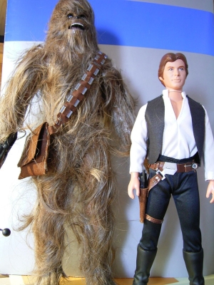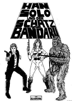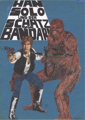 Weil unser erstes Spielfilmprojekt so viel Spaß gemacht hatte, gingen wir einige Zeit später ans nächste. Diesmal mußten die 30 cm großen Kenner-Figuren dafür herhalten. Und weil in "Darth Vaders Rache" weder Han Solo, noch Chewbacca, noch die Millennium Falcon mitgespielt hatten, beschlossen wir, diesmal im wahrsten Sinn des Wortes einen "Solo"-Film zu drehen. Erneut schrieb ich ein Drehbuch mit einer Solo-typischen Handlung, in der der Corellianer und der Wookiee auf eine junge Ex-Piratin treffen und mit ihr einen versteckten Schatz heben wollen. Dieser befindet sich auf einem Dschungelplaneten, auf dem viele Gefahren lauern. Doch auch eine Gangsterbande ist hinter dem Schatz her und folgt der Millennium Falcon auf den Planeten, wo es schließlich zum westernmäßigen Showdown kommt. "Han Solo und der Schatz vom Bandaru" war nicht nur der Titel des 1981 fertiggestellten Films sondern auch des Comics, den ich - basierend auf dem Drehbuch - zeichnete und noch etwas weiter ausschmückte. Dieser 40seitige Comic wurde damals vom ESWFC (dem Vorläufer des OSWFC) netterweise veröffentlicht und kam offenbar gut bei den deutschen Fans an. Mittlerweile hatte ich eine eigene (Ton-)Filmkamera, die jedoch nicht über eine Einzelbildfunktion verfügte. Ein weiterer Film in Stop-Motion-Technik kam daher nicht in Frage, zumal die Kamera meines Kumpels den Geist aufgegeben hatte. Bei den großen Actionfiguren bot sich aber sowieso die Methode an, die Figuren unterhalb des Bildrandes an den Fußgelenken umherzubewegen. Gegenüber Stop Motion hatte dies den Vorteil, daß sich die Figuren realistischer - wenn auch immer noch hölzern - bewegten. Wie auch schon zuvor bauten wir die Kulissen - zum Beispiel das Cockpit der Falcon - selber, vertonten den Film mit Musik, Geräuschen und Dialogen. Spezialeffekte in Form von explodierenden Feuerwerkskörpern und der berüchtigte "Buntstifteffekt" kamen auch wieder zum Einsatz. Auch "Han Solo und der Schatz vom Bandaru" hatte eine Laufzeit von etwas über 20 Minuten, war aber technisch wesentlich geglückter als unser erstes Projekt. Wie wär's mit einer ganzen Serie von Han-Solo-Abenteuern? Da wir beide fanatische Solo-Fans waren, überlegten wir uns, einen weiteren Film mit den Abenteuern des Schmugglerpaares zu drehen. Noch während ich am Drehbuch schrieb, das diesmal einen Schneeplaneten einbezog, nahmen wir die ersten Szenen auf, denn gerade war Schnee gefallen, was wir ausnutzen wollten. Diesmal kamen außer den Großfiguren auch wieder die kleinen Kenner-Figuren zum Einsatz, um bei einigen Szenen für Perspektiveneffekte zu sorgen. Leider wurde dieses titellose Solo-Abenteuer weder als Drehbuch noch als Film je beendet. Veränderungen im Privatleben meines Kumpels und mir zwangen uns, das Projekt auf Eis zu legen. Wie das Leben manchmal so spielt, verloren wir im Laufe der Zeit den Kontakt zueinander; der Film war damit gestorben.
