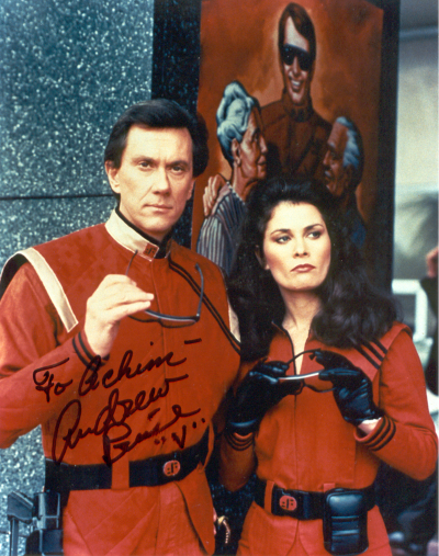 ANDREW PRINE war der infame außerirdische Besucher STEVEN in der Kult-Serie V. Zudem gibt es wohl kaum eine TV-Serie der 80er Jahre, in der er nicht mitgespielt hat. Als riesiger V-Fan mußte ich unbedingt sein Autogramm haben, zumal er der einzige Schauspieler aus dieser Serie vor Ort war. Im Gespräch mit ihm bemerkte ich, daß er eher zu der reservierten Sorte gehört. Als ich ihn fragte, ob ich ein Foto mit ihm zusammen haben könnte (was auf dieser Con völlig üblich und kostenlos war), verlangte er 10 Dollar dafür! Ich fragte noch mal, nicht sicher, ob ich mich verhört hatte, aber er wiederholte seine Forderung. Daraufhin meinte ich nur, daß ich dafür nicht mehr genug Geld übrig hätte. Seither kann ich ihn irgendwie nicht mehr so richtig leiden... | |