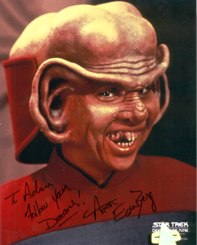 Aron ist ein echt netter Kerl, genau wie sein Alter Ego NOG, Sohn von Rom (Max Grodénchik) in STAR TREK: DEEP SPACE NINE. Ich hatte die Gelegenheit, ihn nach einem langen (Signier- und Panel-) Tag abends immer noch beim Autogrammeschreiben anzutreffen, und er war noch genauso gut gelaunt und freundlich wie am Morgen. Der junge Mime gehört zu den Schauspielern, die nur zu gut wissen, daß sie ihre Popularität den Fans zu verdanken haben, und dem entsprechen sympathisch ist Aron auch. Jeder, der eine ST-Con besucht, sollte unbedingt mal mit ihm quatschen – es lohnt sich! | |
