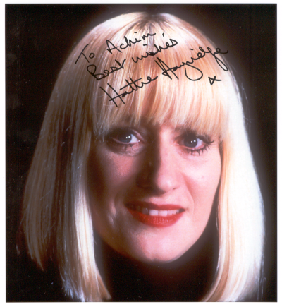 "Red Dwarf" ist die wohl lustigste SF-Serie, die jemals gedreht wurde. Daß sie nach fast 10 Jahren immer noch ein Geheimtipp ist, liegt daran, daß der typische britische Humor, der hier ganz neue Blüten treibt, unmöglich ins Deutsche übersetzt werden kann. Dennoch oder gerade deswegen sollte jeder SF-Fan "Red Dwarf" gesehen haben. Alle SF-typischen Klischees und viele Filme und Serien aus diesem Genre werden darin gehörig auf die Schippe genommen. Hattie spielt darin den 3 Millionen Jahre alten senilen Schiffscomputer "Holly". Kennzeichen von "Holly" ist, daß man immer nur ihren Kopf auf einem Monitor sieht, wenn sie zu der debilen Mannschaft des Raumschiffs "Red Dwarf" spricht, die aus einem aus dem Cryogen-Schlaf aufgetauten Mechaniker 3. Klasse, einem lebenden Hologramm, einer humanoiden Katze und einem exzentrischen Androiden besteht. Auf der Star Wars Celebration Europe Convention 2007 in London traf ich sie (und ihren Vorgänger - siehe "Norman Lovett") völlig überraschend im Händlerraum, wo die beiden zusammen Autogramme gaben. Beide waren unglaublich nett und höflich. Hattie bewunderte sogar mein Kostüm. Ich hätte mich gerne noch länger mit den beiden unterhalten, doch der Andrang der zumeist britischen Fans war leider zu groß.