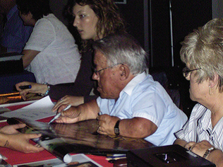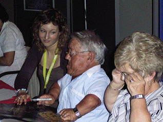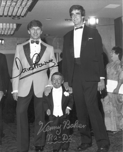 Kenny Baker ist natürlich der unvergessliche R2-D2 aus allen 6 STAR-WARS-Filmen und zusammen mit Anthony Daniels (C-3PO) der einzige Schauspieler, der in allen Episoden der Saga mitgespielt hat. Kenny war der zweite Grund (nach Antonio Fargas) für mich, diese Con zu besuchen. Erstens hatte ich ihn noch nie getroffen, zweitens ist er leider schon sehr alt - wer weiß, wann er sich völlig aus dem Con-Rummel zurückzieht… Wie alt er ist, hat mich dann doch etwas geschockt. Für das Signieren der Autogramm brauchte er mehrere Minuten. Er schrieb wie in extremer Zeitlupe, und man konnte fast meinen, er würde jeden Augenblick einschlafen. Wortkarg aber freundlich, hatte er für jeden Fan ein Lächeln parat. Im Laufe des Tages entschloß ich mich, mir ein zweites Autogramm von ihm zu holen, diesmal ein Gruppenfoto mit ihm, Dave "Darth Vader" Prowse und Peter "Chewbacca" Mayhew von der amerikanischen Premiere von Episode IV, auf dem 1994 schon Dave während der Jedi-Con unterschrieben hatte. Kennys neben ihm sitzende Ehefrau war total begeistert von dem Bild, erzählte die eine oder andere Anekdote über diesen Tag und zeigte es allen anderen Schauspielerkollegen. Sie meinte zu mir, ich solle es unbedingt noch Dave Prowse zeigen, was ich dann auch tat. Auch Dave plauderte darüber aus dem Nähkästchen, meinte jedoch, es sei von der Premiere von Episode V gewesen. Ein amerikanischer Fotograf hätte es gemacht. Ursprünglich gab es 700 Stück davon, die Dave einfach nicht loswerden konnte. Deswegen also hatte ich es auf der Jedi-Con 1994 also umsonst bekommen! Während der Jahre wurde das Bild jedoch ohne Erlaubnis vervielfältigt, was Dave nicht so gut gefällt. Er drehte meins um und stellte aufgrund des auf der Rückseite angebrachten Stempels mit fortlaufender Nummerierung zufrieden fest, daß es sich um eines dieser Originale handelte.