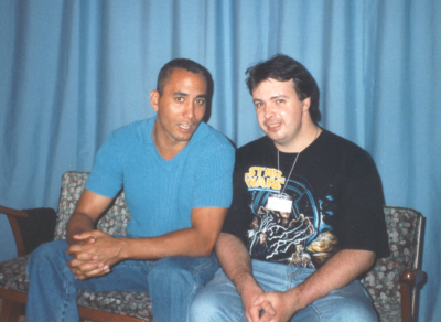 Richard Biggs war der Stationsarzt DR. STEPHEN FRANKLIN in der Kult-SF-Serie BABYLON 5. Obwohl er nie zu meinen Lieblingscharakteren in der Serie oder zu meinen Lieblingsschauspielern gehörte, ist dies heute der Fall. Bisher kann ich über diesen Mann am meisten erzählen, denn mit ihm habe ich mehr gesprochen und mehr schöne Momente erlebt als mit allen anderen Con-Gästen. Irgendwie stimmte die Chemie zwischen uns. An einem Abend an der Bar redeten wir darüber, daß Rick vorhatte, Fans zu den Dreharbeiten zu BABYLON 5 einzuladen, die für eine wohltätige Organisation gespendet hatten, die er enthusiastisch unterstützte. Es ging um gehörlose oder –geschädigte Kinder, denn Rick war selbst auf einem Ohr taub. Ich bekundete Interesse, und er wollte noch mit dem Serien-Erfinder J. Michael Straczinsky darüber telefonieren. Leider wurde daraus nichts, aber dieser Abend verlief trotzdem echt komisch. Rick flirtete mit der Barkeeperin, und als sie ihm sagte, sie hätte einen Freund, brachte ich ihm das schöne deutsche Wort „Wichser“ bei. Sofort rief er laut – den Freund der Barkeeperin meinend – „Wichser“ in den Raum. Die Reaktion der Leute kann man sich vorstellen. Rick erschrak fast, deutete auf mich und sagte immer wieder: „He told me that! He told me!“ Auf dem Foto oben sprechen wir – sofern ich mich richtig erinnere – gerade darüber, daß aus dem Set-Besuch generell nichts werden wird. Der Grund, warum Rick mittlerweile mein Lieblings-B5-Schauspieler und einer meiner Lieblingsschauspieler ist, liegt nicht nur darin, daß wir uns so gut verstanden und viel miteinander geredet und Spaß gehabt haben, sondern auch leider in der traurigen Tatsache, daß er 2004 völlig unerwartet verstorben ist.