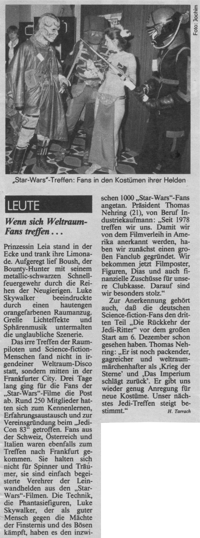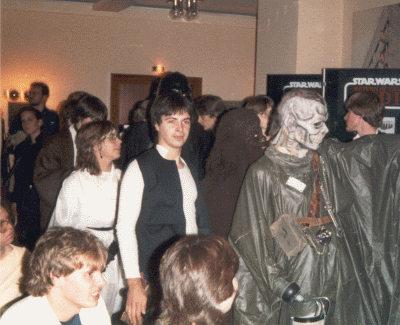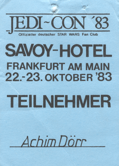 Die Jedi-Con 1983 war nicht nur meine erste Star-Wars-Con, sondern die erste Convention überhaupt. Zwar hatte ich im Fandom viel über ähnliche Cons in den USA gehört, die es seit Mitte der 70er Jahre hauptsächlich zum Thema "Star Trek" gab, doch besucht hatte ich noch nie eine. Als dann der Erste Deutsche Star Wars Fan Club (ESWFC) - der Vorläufer unseres OSWFC - bekanntgab, daß vom 22. bis 23. Oktober 1983 im Frankfurter Savoy-Hotel die allererste deutsche Convention stattfinden sollte, war ich sofort begeistert und meldete mich an. Ich war damals 19 Jahre alt, und mein damaliger bester Freund, der auch ESWFC-Mitglied und in meiner Klasse war, schloß sich mir an. Schon etwa ein Jahr zuvor hatte ich mir mein erstes Kostüm selbstgemacht - das Han-Solo-Outfit aus Episode IV. Der Blaster war von Kenner; Gürtel und Holster hatte ich ich mir aus einer alten Aktentasche aus Leder selbst gebastelt. Das Hemd hatte mir meine Mutter "umgeschneidert", die Weste ließ ich von einer Schneiderin nach eigenen Entwürfen nähen, die mir auch die corellianischen Blutstreifen auf die dunkelblaue Jeans nähte. Die (Gummi-)Stiefel bekam ich für günstige 30 DM in einem Reitergeschäft. Jedenfalls traten wir beide im Golf meiner Mutter und sehr gespannt die etwa 200 km weite Reise nach Frankfurt an. Ein echter Schauspieler sollte anwesend sein: Boba Fett persönlich - der Brite Jeremy Bulloch. Das wäre schon für sich eine Sensation gewesen, doch es gab ein weiteres Highlight: eine spezielle Aufführung von Episode VI extra für uns Con-Teilnehmer in einem Frankfurter Kino noch vor dem offiziellen Deutschlandstart! Daher war es auch die englischsprachige Originalversion - das erste mal, daß ich einen Star-Wars-Film im Original sah. In Frankfurt angekommen, war das (Verkehrs-)Chaos groß. Dennoch fand ich mit dem untrüglichen Orientierungssinn der Corellianer das Savoy-Hotel. Gut war, daß das Hotel über eine Tiefgarage verfügte, in die ich auch sofort hineinfuhr. Schlecht war, daß die Garage gesperrt war. Aber ein echter corellianischer Schmugglerpilot hat auch keine Probleme damit, sein Gefährt rückwärts die spiralförmige Zufahrt zur Tiefgarage wieder zurückzufahren… An der Hotelrezeption trafen wir dann schon auf die ersten Fans in Kostümen. Und welch geniale Kostüme dabei waren…! Wir fühlten uns sofort zuhause und kamen schon in ersten Kontakt mit den anderen Fans. An den genauen Programmablauf kann ich mich nicht mehr erinnern, aber ich weiß noch, daß ich mich wie zuhause fühlte - in einer Galaxis weit, weit entfernt. Auf der Willkommensparty traf ich auf Leute, die ich schon Briefeschreiben kannte und lernte viele neue Gleichgesinnte kennen. Auch der weibliche Star-Wars-Fan, der kurze Zeit zuvor Kandidatin bei der Quizshow "Der große Preis" mit dem Thema "Krieg der Sterne" zu Gast gewesen war, war da - fast schon eine Berühmtheit! Eine echte Berühmtheit war jedoch in Gestalt von Jeremy Bulloch anwesend, der für uns eine Art Panel mit Frage- und Antwort-Teil abhielt. Das war damals schon eine große Sache. Ich weiß auch noch, daß ich mich mit Fans unterhalten wollte, aber die Musik dafür zu laut war. Ich zog also meinen Blaster und zielte in Richtung Lautsprecherboxen - in genau diesem Moment schaltete jemand die Musik ab! Das Gelächter war groß. Bei einem Quiz gewann ich - ausgerechnet - eine Han-Solo-Zahnbürste. Eine Menge Fans wollten sie mir sofort abkaufen, aber ich gab sie nicht her. Sie ist heute noch ein seltener Teil meiner Star-Wars-Sammlung. Am Samstag marschierten dann gut 250 Con-Teilnehmer (ein großer Teil in Kostümen) quer durch Frankfurt zum Kino. Die Passanten schauten uns an, als gäbe es eine außerirdische Invasion. Im Foyer des Kinos wartete auch schon Jeremy auf uns. Einige Fans waren so mutig, mit ihm zu reden. Ich starrte ihn nur völlig verschüchtert an, was er auch bemerkte und mich mit einem "hi" begrüßte. Ich war so verlegen, daß ich auch nur "hi" sagte und weiterging. Hinterher ärgerte ich mich, daß ich nicht mit ihm gesprochen hatte, doch dieses Versäumnis habe ich seither schon einige male auf den späteren Jedi-Cons nachgeholt. Es war ein einzigartiges Erlebnis, mit einem Kino voller Fans "Return Of The Jedi" in der Originalfassung zu sehen. Es wurde gejubelt, gebuht, und als am Ende Darth Vader starb, gingen -zig Feuerzeuge an - der Wahnsinn! An diese allererste Jedi-Con habe ich nur gute Erinnerungen. Für mich war das erst der richtige Einstieg ins aktive Fandom und ein Erlebnis, das mich entscheidend geprägt hat. Ich schwor mir damals, auch zukünftig keine einzige Jedi-Con zu verpassen und habe diesen Eid bis heute eingehalten.
